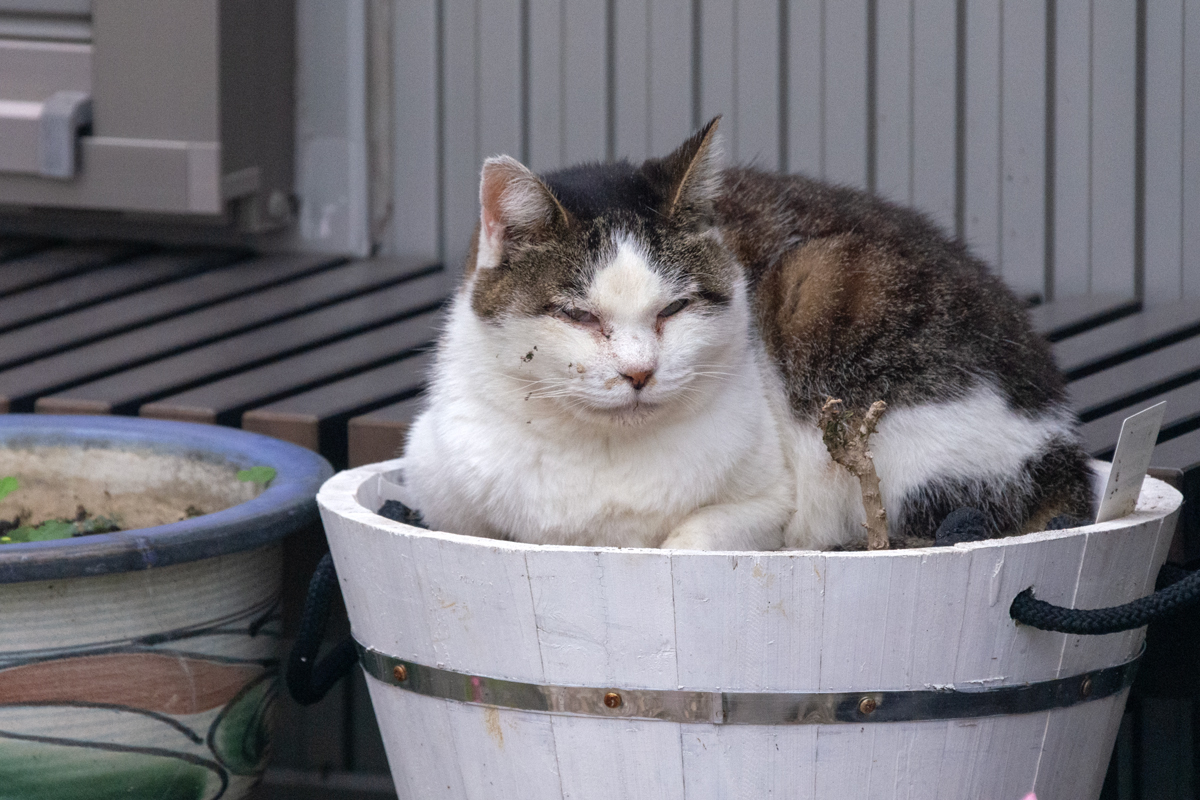 今日のコースは西国立〜立川を大回りで。ゴメン顔の訃報に触れたあと、次に見かけたのは寝坊助のキジ白だった。