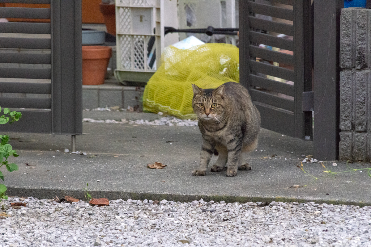 今日の猫関係業務は挟間という東京都民にもあまり知られていない山間の小駅からスタート。猫密度は低いものの割と好きなコースの一つで、前の晩から楽しみにしていたのだが、あいにく雲が厚くてとても暗く、せっかく見つけたのに撮影を諦めたのが5匹もいた。KPが修理から戻ってきていないのも痛かった。